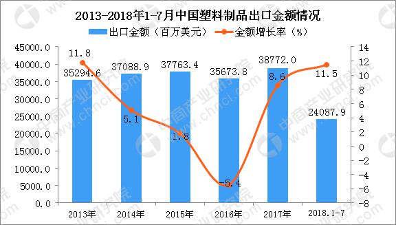2013年-2015年中國塑料制品出口金額呈增長趨勢,2016年中國塑料制品出口金額有小幅度下降;2018年1-7月中國塑料制品出口金額為24087.9百萬美元,同比增長11.5%。
