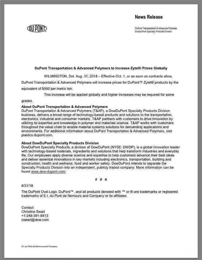 DuPont™ Zytel®(杜邦尼龍系列)產(chǎn)品的價格上漲相當(dāng)于每公噸550美元(注:折合人民幣3778元/噸,漲價涵換算的人民幣價格不包括增值稅、關(guān)稅及其他報關(guān)雜費),此次增幅將在全球范圍內(nèi)應(yīng)用。個別材料可能漲幅更大!2018年8月31日 - 自10月1日起生效。
