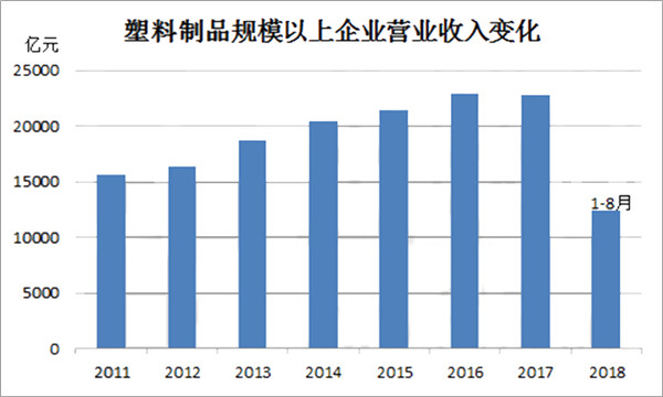 2011年至2018年期間,我國塑料制品行業(yè)規(guī)模以上企業(yè)主營業(yè)務(wù)收入的變化情況如下: