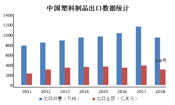 近年來,受益于我國“穩(wěn)外貿(mào)”政策的提振作用,國內(nèi)塑料制品出口保持良好的增長態(tài)勢。根據(jù)統(tǒng)計(jì)數(shù)據(jù)顯示,2011年-2017年,中國塑料制品出口量從795萬噸增長至1173萬噸;同期,塑料制品出口額從234.68億美元增長至398.1億美元。總體看來,在政策利好的作用下,我國塑料制品行業(yè)出口將呈穩(wěn)定增長的趨勢。