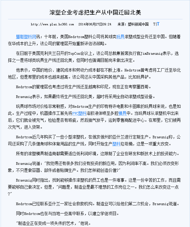 【2014-6-27】滾塑企業(yè)考慮把生產(chǎn)從中國(guó)遷回美國(guó)