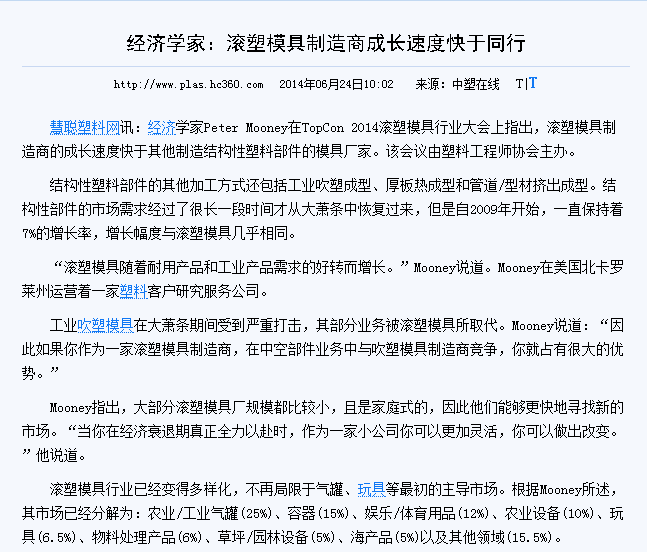【2014-6-24】滾塑模具制造商成長速度快于同行