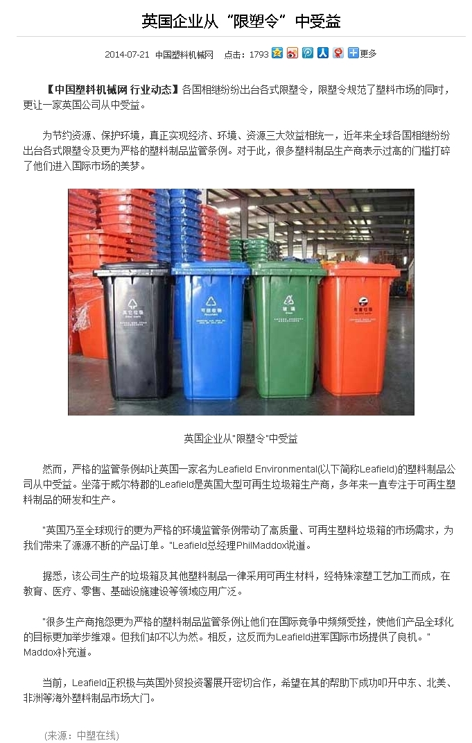 【2014-7-21】英國企業(yè)從“限塑令”中收益